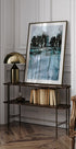 Eine poetische Aquarelllandschaft von Helena Ryhle: Schlanke Bäume säumen das Ufer, ihre Silhouetten spiegeln sich im stillen Wasser. Kühle Blaugrautöne, leichter Nebel und sanfte Pinselstriche schaffen eine ruhige, winterliche Atmosphäre mit einem Hauch Melancholie – perfekt für moderne, nordische Einrichtung. Schafft Ruhe und Tiefe.
