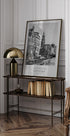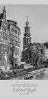 Melanie Violas sort-hvide byportræt fanger De Munt i hjertet af Amsterdam: Munttoren spejler sig i kanalen, cykler læner sig mod rækværket, og smalle huse rejser sig i grafisk rytme. En elegant, moderne komposition, hvor typografien “AMSTERDAM” sætter fokus og giver motivet urban puls og historisk tyngde.