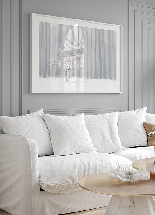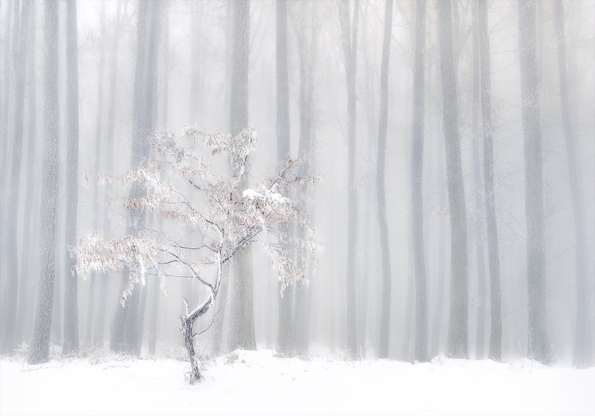 Et ensomt træ står foran et slør af vintertåge, hvor sneen dæmper hvert spor og lyset bliver silkeblødt. Den højlyse komposition skaber ro og eftertanke, mens skovens konturer forsvinder i dis. Et poetisk, minimalistisk landskab af fotografen Peter Svoboda MQEP. Perfekt til at bringe vinterens stille poesi ind i hjemmet.