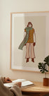 In my Winter Woolies af Tara Royle viser en stiliseret kvindefigur, nøgen men varmt pakket ind i en bred, stribet halstørklæde og robuste vinterstøvler. Minimalistiske former og en blød palet af rosa, fersken og mint skaber en retro, Matisse-inspireret stemning – både sensuel, legende og vinterligt hyggelig.