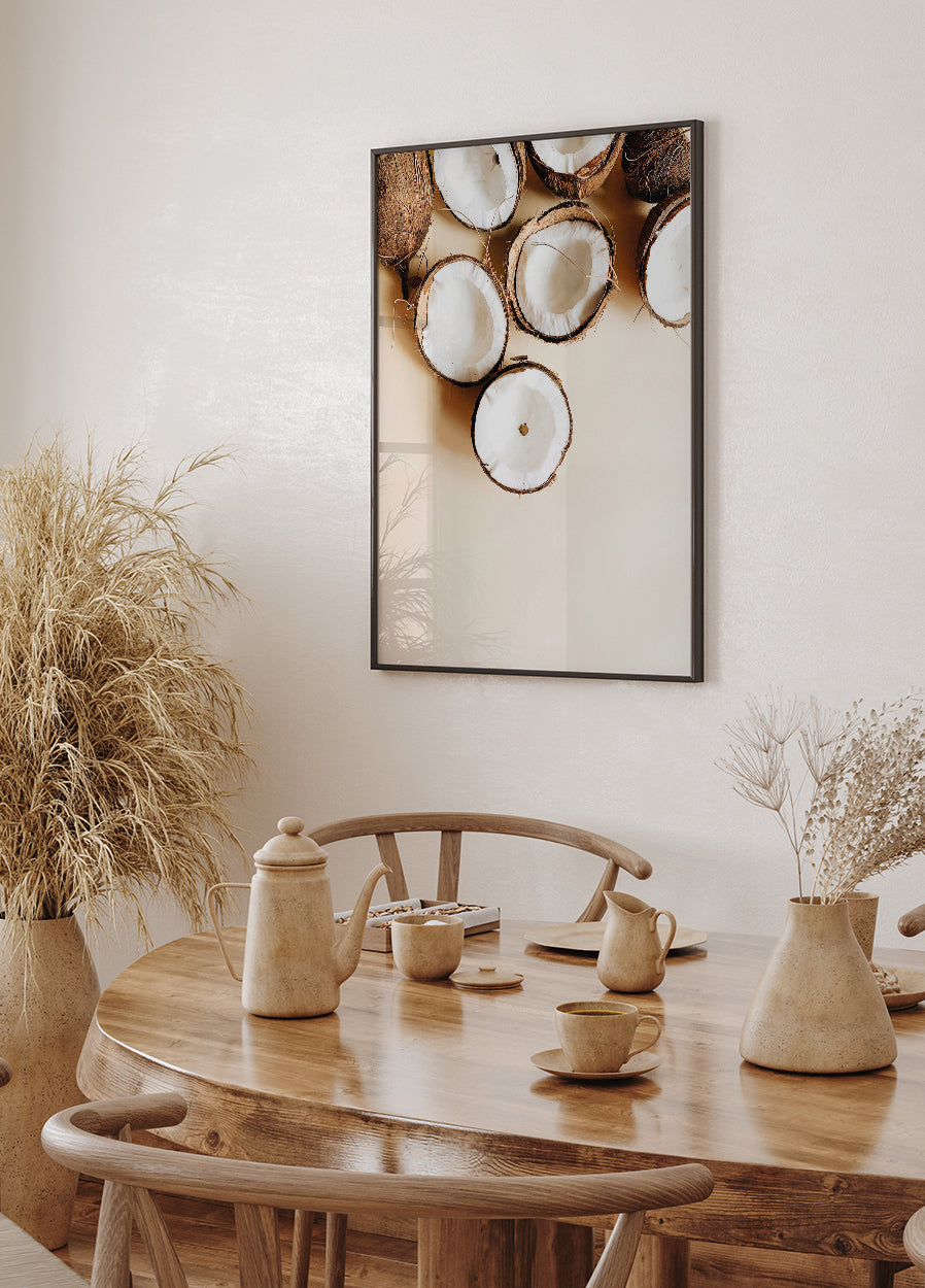Ein frisches Poster mit einem Kokosnussmotiv, das das tropische und exotische Gefühl einfängt. Perfekt, um jedem Raum eine sommerliche und entspannende Atmosphäre zu verleihen, egal ob zu Hause oder im Büro.