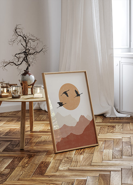 Eine ruhige und minimalistische Darstellung von drei Kranichen, die anmutig vor einem großartigen Sonnenuntergang fliegen. Die Silhouetten schweben über geschichteten, erdfarbenen Bergen und schaffen eine harmonische und beruhigende Atmosphäre. Perfekt, um jedem Dekor ruhige und zeitlose Schönheit zu verleihen.