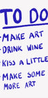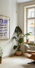 Ein verspieltes und motivierendes Typografie-Stück mit einer handgeschriebenen „To Do“-Liste: Machen Sie Kunst, trinken Sie Wein, küssen Sie sich ein wenig, machen Sie mehr Kunst. Mit kräftigem blauem Text auf weißem Hintergrund vereint dieses lustige und moderne Poster Humor, Romantik und Kreativität – perfekt für Paare, Künstler oder alle, die es lieben, mit Leidenschaft zu leben.