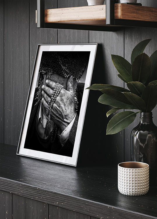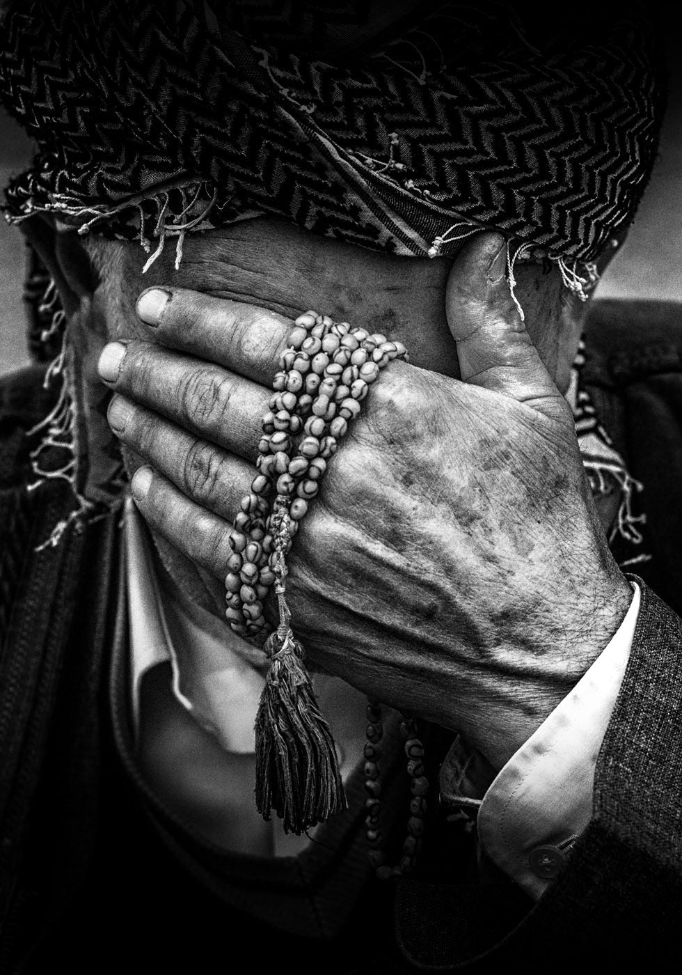 Ein starkes Schwarz-Weiß-Porträt, das die tiefen Gefühle eines älteren kurdischen Mannes einfängt. Seine wettergegerbten, mit Gebetsperlen geschmückten Hände bedecken Teile seines Gesichts und drücken Nachdenklichkeit, Stärke und kulturelles Erbe aus. Ein ergreifendes Foto, das rohe Emotionen und Tradition in jedes Dekor bringt.
