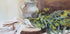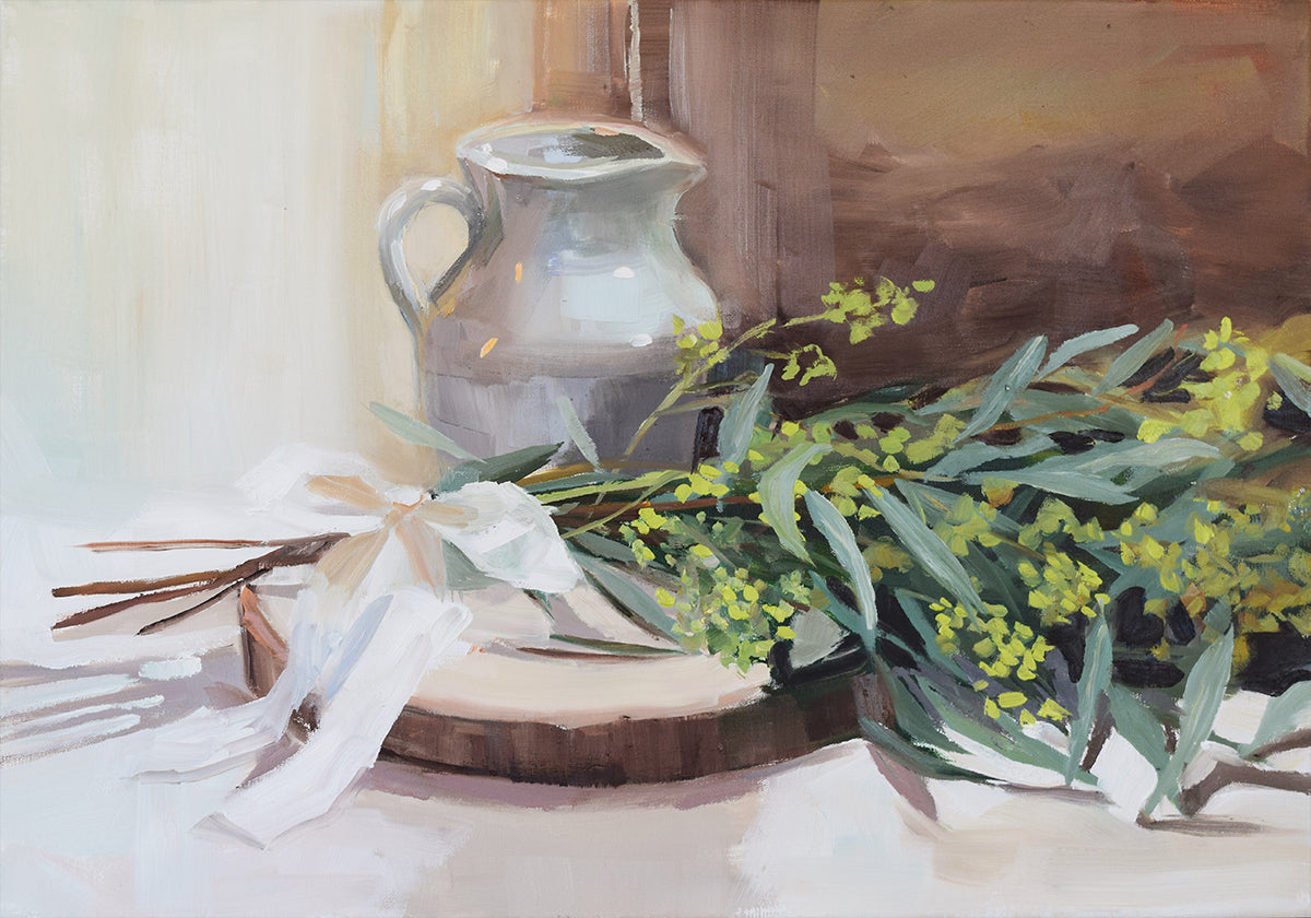 Ein bezauberndes Stilllebengemälde eines rustikalen Kruges mit zartem Blattwerk und daneben arrangierten gelben Blumen. Das Kunstwerk fängt mit seinen malerischen Pinselstrichen, gedämpften Tönen und sanften Kontrasten eine warme, zeitlose Atmosphäre ein. Perfekt, um eine gemütliche Atmosphäre im Vintage-Stil zu schaffen.