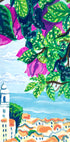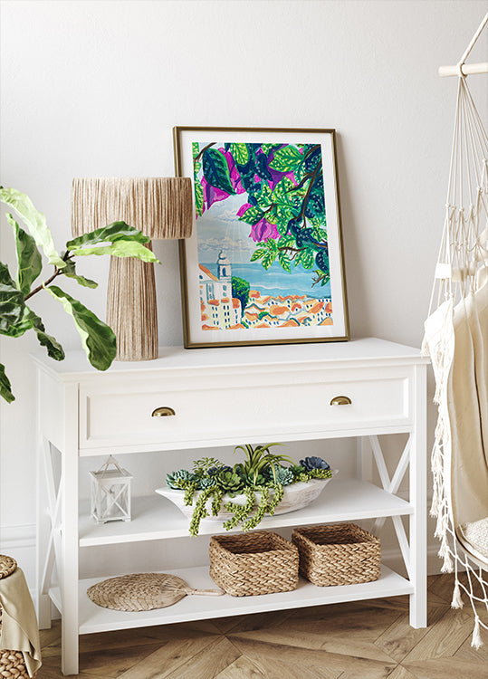 En levende hyldest til Lissabon: solbeskinnede facader, blomster i vinduerne og et mylder af farverige huse, der trinvist falder mod det blå hav. De frie penselstrøg og den impressionistiske stemning indfanger byens pulserende energi. Med udsigt over bakker og tage, badet i varme farver. Skabt af Pauline Wegman | Key and Sea Creative.