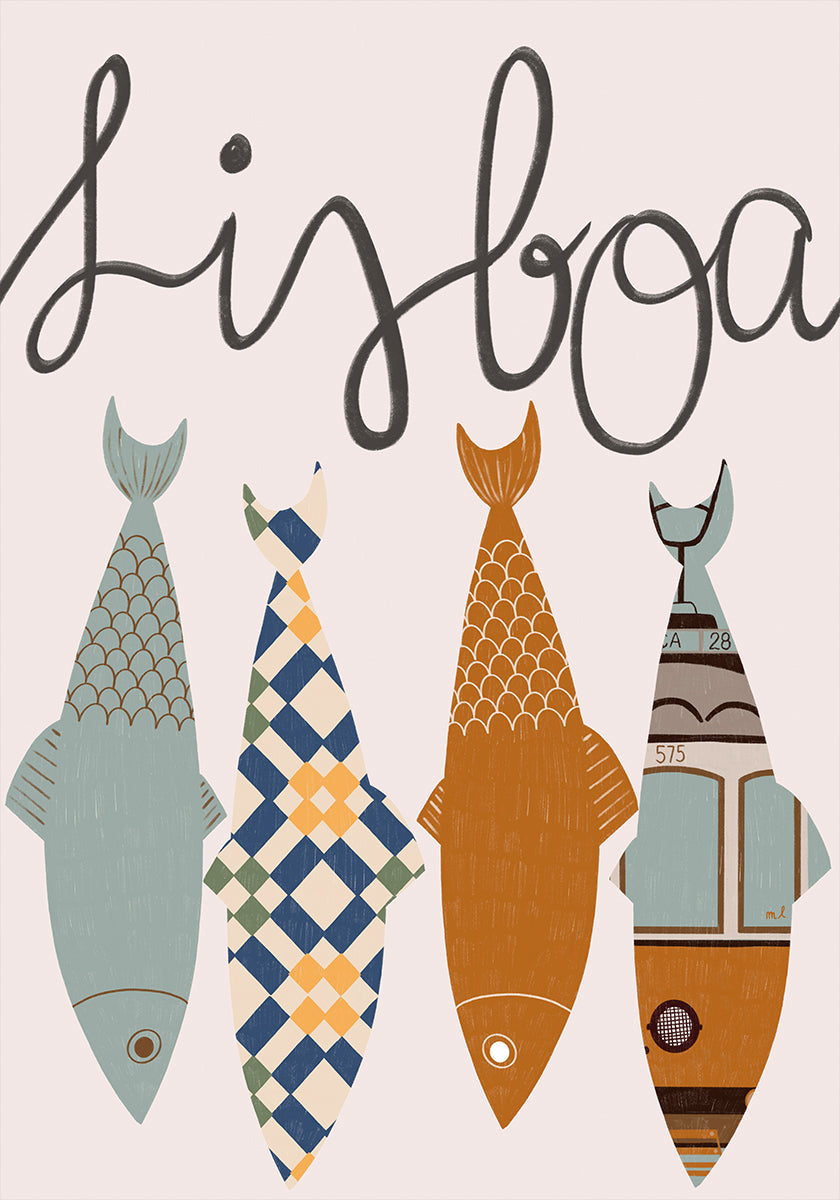Lisbon Sardines af Menina Lisboa hylder Lissabons maritime sjæl med et grafisk sardin-mønster inspireret af azulejos. De klare blå og gule toner skaber en frisk, solrig stemning, hvor tradition møder leg. Perfekt til køkken eller stue, hvor du vil bringe portugisisk charme ind i hverdagen. En hyldest til havets fangst og byens traditioner.