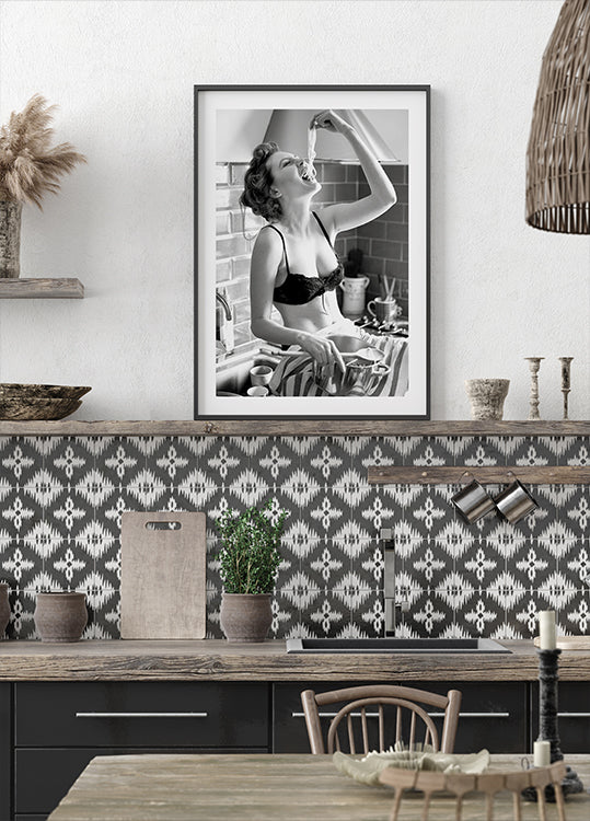 Ein verspieltes und auffälliges Schwarz-Weiß-Foto einer Frau, die Spaghetti in einer Küche im Vintage-Stil genießt. Mit einer entspannten Haltung strahlt sie Selbstvertrauen und Humor aus und macht dieses Kunstwerk zu einer stilvollen und unterhaltsamen Ergänzung für moderne Innenräume. Perfekt für Küchendekor, Feinschmecker und Fotografie-Enthusiasten.