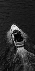 Eine elegante Yacht schneidet in starkem Kontrast durch das dunkle Wasser, von oben in raffiniertem Monochrom eingefangen. Dieses minimalistische Motiv zelebriert Freiheit, Präzision und die Ästhetik der Bewegung – ideal für moderne Innenräume mit Sinn für Stil und Ruhe.