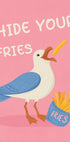 Eine verrückte und humorvolle Illustration einer Möwe, die Pommes stiehlt, mit dem verspielten Text „Hide Your Fries“. Dieses farbenfrohe Poster bringt Strandatmosphäre und frechen Charme in Ihr Zuhause und eignet sich perfekt für die Küche, das Kinderzimmer oder Innenräume, die Humor und Lichtdesign bevorzugen.