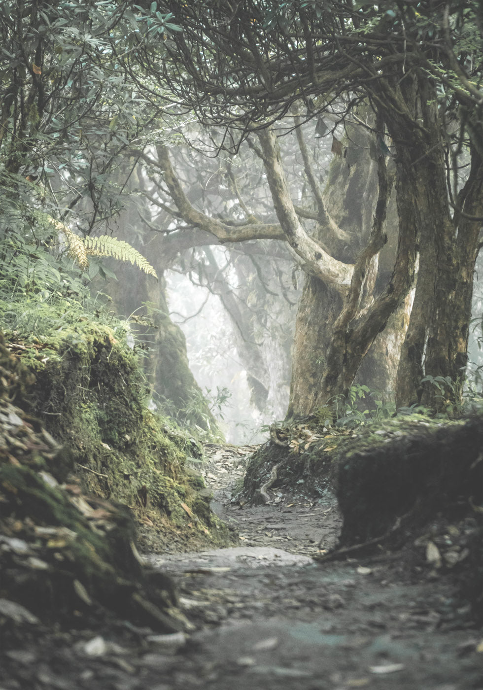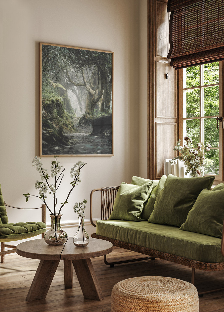 Ein Poster, das die magische und geheimnisvolle Atmosphäre eines Waldes einfängt, perfekt, um jedem Raum eine verträumte und stimmungsvolle Atmosphäre zu verleihen, ideal für diejenigen, die märchenhafte Natur lieben.