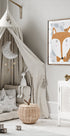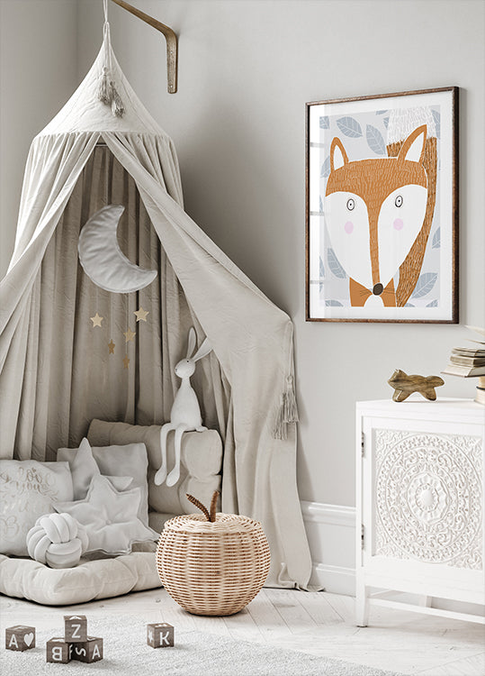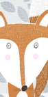 Ein niedlicher Rotfuchs steht inmitten einer stilisierten Winterlandschaft, umgeben von grauen Blattmotiven, die ein ruhiges, nordisches Muster bilden. Die warmen Rottöne kontrastieren mit den kühlen Grautönen und schaffen eine gemütliche, grafische Atmosphäre mit verspieltem Ausdruck. Erstellt von der Künstlerin Carla Daly – perfekt für Kinderzimmer und nordische Einrichtung.