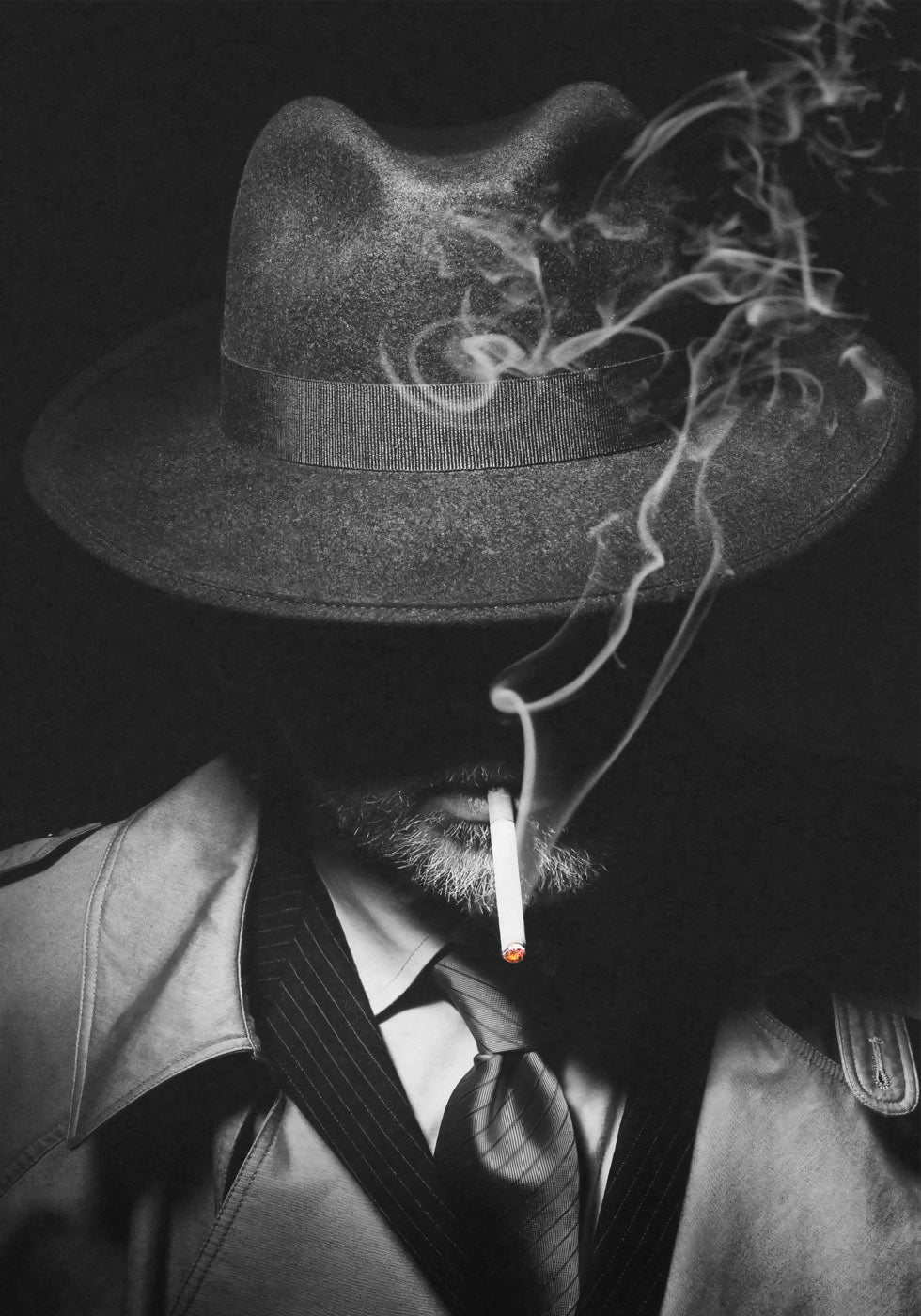 Ein dramatisches Schwarz-Weiß-Porträt eines mysteriösen Mannes mit Fedora-Hut und Trenchcoat, der Zigarettenrauch ausatmet. Die tiefe Beleuchtung und die Schatten erzeugen eine klassische Noir-Atmosphäre, die an alte Hollywood-Detektivfilme erinnert. Perfekt für Liebhaber von Film Noir, Vintage-Krimigeschichten und zeitlosen Filmmotiven.