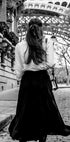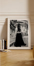 Ein anmutiges Schwarz-Weiß-Foto einer Frau, die unter dem Eiffelturm läuft, einen fließenden Rock trägt und die Haare mit einer Schleife zusammengebunden hat, strahlt Pariser Charme und zeitlose Eleganz aus. Dieser Druck fängt die Romantik der Pariser Straßen und Mode ein und ist ein bezauberndes Statement für Innenräume, die von Reisen, Stil und Eleganz inspiriert sind.