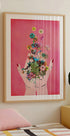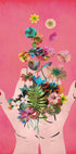 Ein lebendiges und modernes Kunstwerk, das Hände zeigt, die vor einem rosa Hintergrund eine Explosion bunter Blumen und Blätter freisetzen. Die Blumencollage vereint Natur und Kreativität und symbolisiert Wachstum, Erneuerung und Schönheit. Perfekt für moderne Innenräume mit einem Hauch von botanischem Charme.