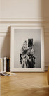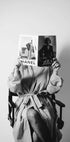 Ein raffiniertes Schwarz-Weiß-Foto einer Frau in einem Trenchcoat und gepunkteten Strumpfhosen, die Modemagazine mit Chanel und Elle hochhält. Das Kunstwerk strahlt zeitlosen Stil und Pariser Eleganz aus und eignet sich perfekt als Statement-Stück in modernen, modebewussten Innenräumen.