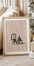 Ein bezauberndes, von Stickereien inspiriertes Kunstwerk mit einer schwarzen Katze, die an einem Fenster sitzt und auf den Schnee blickt. Ein geschmückter Weihnachtsbaum mit Geschenken sorgt für Gemütlichkeit und eine weihnachtliche Atmosphäre, perfekt als Weihnachtsdekoration für zu Hause.