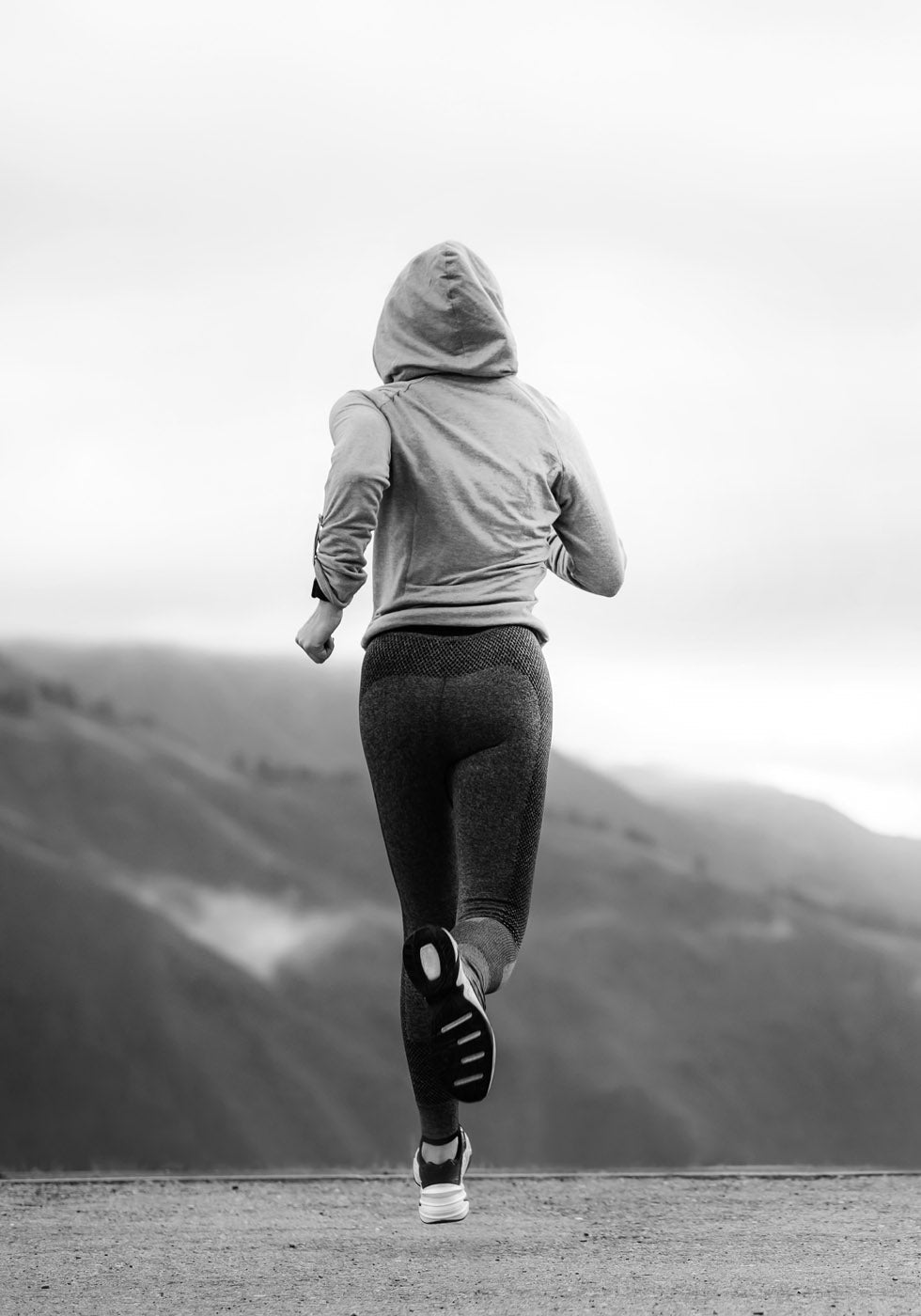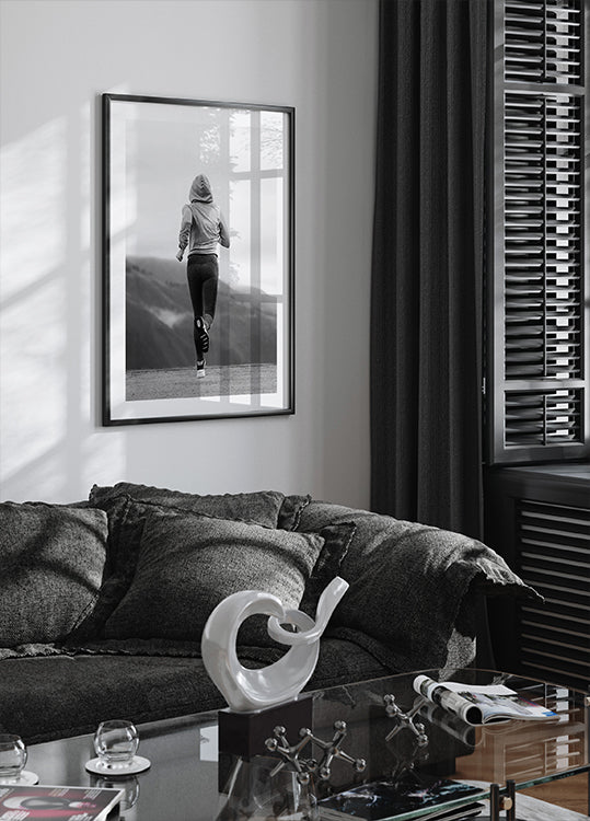 Ein beeindruckendes Schwarz-Weiß-Foto, das die Essenz von Beharrlichkeit und Entschlossenheit einfängt. Dieses Kunstwerk zeigt einen Läufer in Bewegung vor einer Bergkulisse und symbolisiert Stärke, Ausdauer und Entschlossenheit. Ein perfektes Motivationsposter für Fitnessbegeisterte und diejenigen, die einen aktiven Lebensstil führen.
