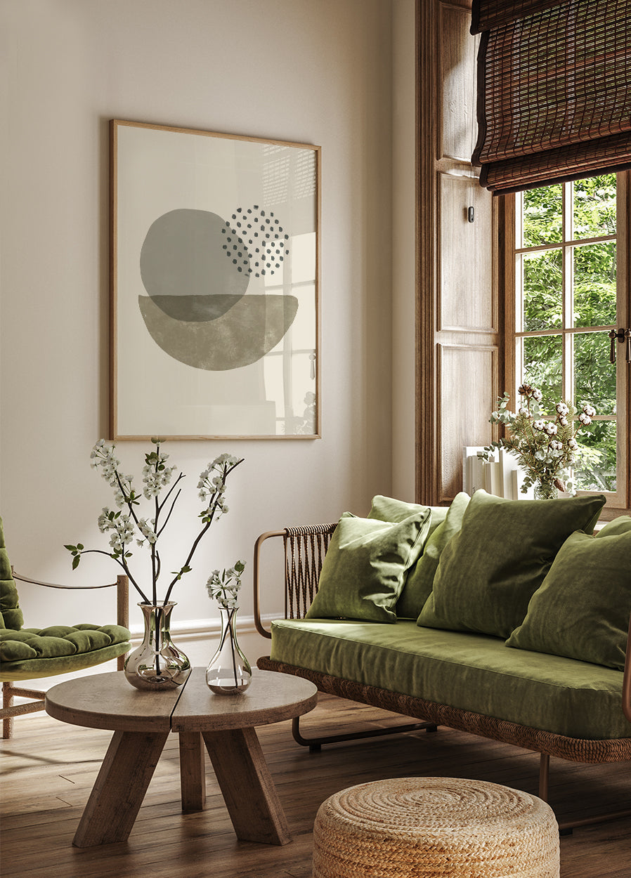 Das Poster zeigt eine minimalistische Komposition mit organischen Formen in gedeckten Farben. Ein großer grauer Kreis überlappt einen beigen Halbkreis, während eine Ansammlung kleiner, dunkler Punkte darüber schwebt. Der Hintergrund ist in Hellbeige gehalten, was einen ruhigen und harmonischen Eindruck vermittelt. Das schlichte Design passt gut in moderne Interieurs.