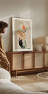 Eine moderne abstrakte Illustration tropischer Früchte wie Papaya, Feige und Zitrusfrüchte, elegant ausbalanciert über einer stilisierten Hand. Mit erdigen Tönen und markanten Konturen zelebriert das Kunstwerk Frische, Natur und die lebendige Schönheit des Alltags. Ein perfektes Stück für Küchen und moderne Innenräume.