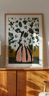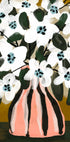 Ein kühnes und elegantes Blumenstillleben mit weißen Blumen in einer gestreiften rosa Vase. Mit Vintage-inspiriertem Charme und Pastellfarben vereint das Kunstwerk modernen grafischen Stil mit botanischer Weichheit und eignet sich perfekt als Dekoration in modernen und stilvollen Innenräumen.