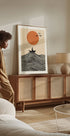 Eine minimalistische Illustration einer einsamen Figur in einem kleinen Boot, die auf wogenden schwarzen Wellen unter einer leuchtend orangefarbenen Sonne schwimmt. Die klaren Linien und warmen Töne erzeugen eine ruhige, nachdenkliche Stimmung – ein ideales Stück für moderne Räume, die Ruhe und Einfachheit ausstrahlen.