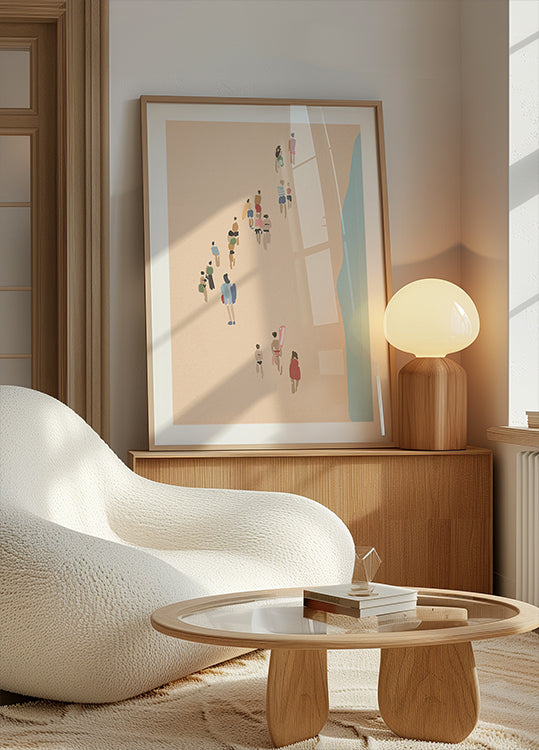 Eine einfache und friedliche Illustration von Strandbesuchern auf dem Weg zum Meer, gemalt in sanften Pastellfarben. Perfekt, um in Sommerhäusern oder Strandhäusern eine leichte und entspannte Atmosphäre zu schaffen.