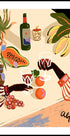 Eine farbenfrohe Illustration eines tropisch inspirierten Stilllebens mit Händen, die Weingläser zwischen frischem Obst, Blumen und Pflanzen anstoßen. Mit kräftigen Farben und verspielten Details fängt das Werk die Wärme des geselligen Beisammenseins und des Bierlebens ein und wird zu einem lebendigen und stilvollen Statement.