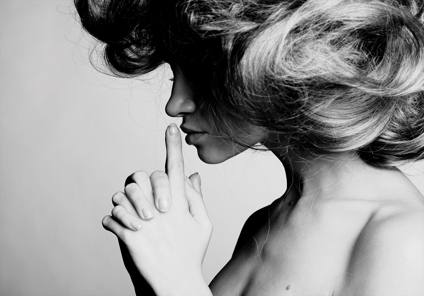 Ein bezauberndes Schwarz-Weiß-Porträt einer Frau mit voluminösem Haar, aufgenommen in einem Moment der Besinnung. Ihre zarte Pose mit einem Finger auf den Lippen ruft ein Gefühl von Geheimnis und stiller Eleganz hervor. Die monochrome Palette verstärkt Kontrast und Textur und verleiht dem Bild ein zeitloses und anspruchsvolles Gefühl.
