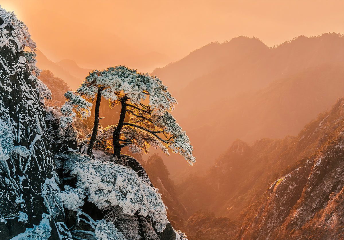 Resilience on the Edge von Wei (David) Dai fängt eine winterliche Berglandschaft im ersten Tageslicht ein: Schneebedeckte Tannen klammern sich an einen steilen Felsrand, während das stille Leuchten der Sonne den Horizont durchbricht. Ein Bild von Stärke und Ruhe, in dem Kälte, Höhe und Hoffnung in einem poetischen Sonnenaufgang aufeinandertreffen. Perfekt zum Träumen von neuen Gipfeln.