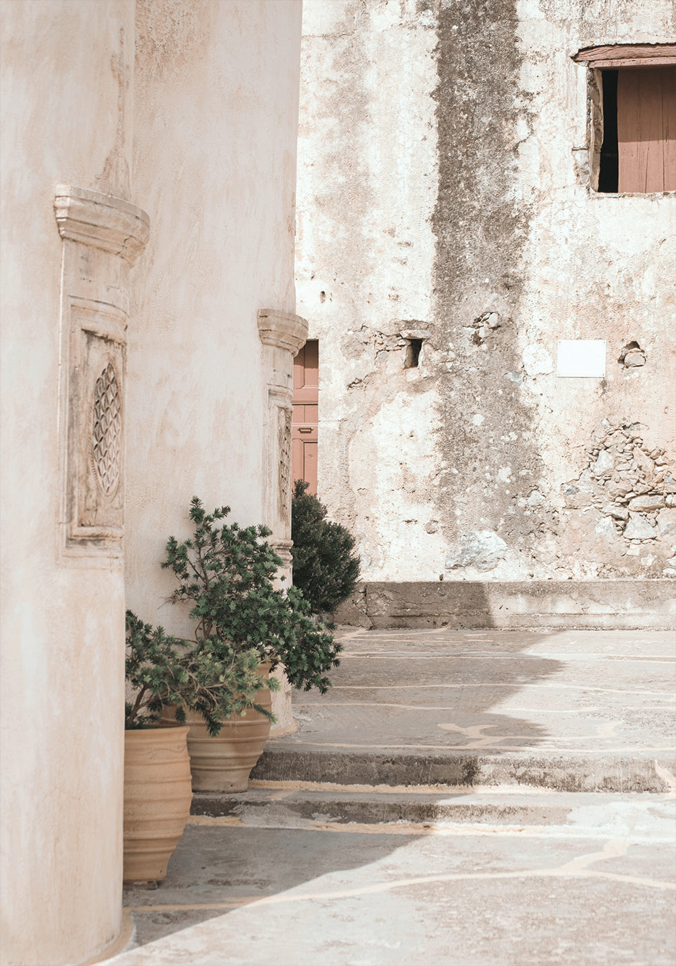 Ein ruhiges Motiv einer rustikalen Ecke in einer mediterranen Straße mit alten Wänden, Topfpflanzen und sanftem Sonnenlicht. Dieses Kunstwerk fängt den zeitlosen Charme mediterraner Architektur und die Schönheit der Einfachheit ein und eignet sich perfekt für die Schaffung einer entspannten Atmosphäre.