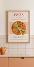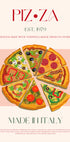 Dieses Retro-inspirierte Kunstwerk zeigt eine farbenfrohe Illustration geschnittener Pizza mit verschiedenen Belägen wie Oliven und Peperoni. Mit dem 1979 gegründeten Text „PIZZA“ stehen frische, hausgemachte Teige und authentische italienische Herkunft im Vordergrund.