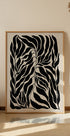 Ein mutiges und elegantes Poster mit abstrakten schwarzen Blattsilhouetten auf beigem Hintergrund. Dieses minimalistische botanische Kunstwerk kombiniert organische Formen mit starken Kontrasten und eignet sich perfekt für moderne und zeitgemäße Innenräume.