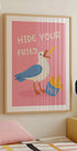 Eine verrückte und humorvolle Illustration einer Möwe, die Pommes stiehlt, mit dem verspielten Text „Hide Your Fries“. Dieses farbenfrohe Poster bringt Strandatmosphäre und frechen Charme in Ihr Zuhause und eignet sich perfekt für die Küche, das Kinderzimmer oder Innenräume, die Humor und Lichtdesign bevorzugen.