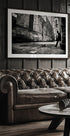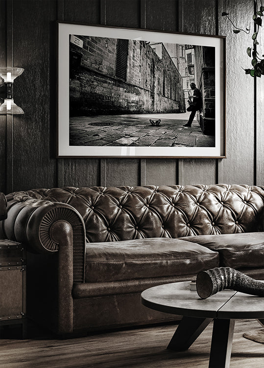 Eine stimmungsvolle schwarz-weiße Stadtszene: Ein einsamer Saxophonist ergießt Jazz in eine enge Straße Barcelonas, Balkone und Backsteinmauern umrahmen das Haus. GertJan van Geerenstein fängt den ruhigen Puls der städtischen Einsamkeit ein, wo Schatten, Perspektive und anhaltende Notizen die Gasse in eine Bühne verwandeln. Eine filmische Stille liegt in der Luft.