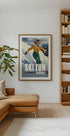 Ein Retro-inspiriertes Reiseplakat von Andreas Magnusson: Ein dynamischer Skifahrer in einem farbenfrohen Parka schneidet durch den Pulverschnee die Piste hinunter, während sich im Hintergrund die majestätischen Berge und dunklen Kiefernwälder Quebecs erheben. Klare, grafische Formen und gedämpfte Vintage-Farben fangen die frische nordische Winterstimmung für Abenteuer ein.