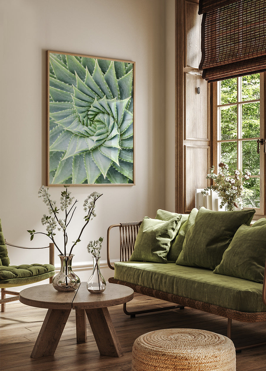 Das Poster zeigt eine Nahaufnahme einer Aloe Vera-Pflanze mit einer spiralförmigen Struktur aus grünen Blättern. Die spitzen Blätter gehen strahlenförmig von der Mitte aus und erzeugen ein optisches Muster, das die natürliche Symmetrie und Textur der Pflanze hervorhebt. Die Farben sind weich und gedämpft und vermitteln einen ruhigen und organischen Ausdruck.