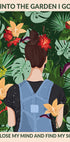 Dieses Kunstwerk zeigt eine Person in Jeans, umgeben von üppigem Grün und leuchtenden Blumen, und erinnert an Themen wie Natur, Frieden und Selbstfindung. Der Text betont, wie man in einer Gartenumgebung Frieden und Seele findet. Perfekt für Achtsamkeit und Gartenarbeit.