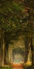 Ein verträumter Waldweg voller Herbstblätter, umgeben von hohen Bäumen und sanftem goldenem Licht. Dieses Kunstwerk fängt die stille Schönheit der Natur ein und weckt Gefühle von Frieden, Besinnung und zeitlosen Reisen durch bezaubernde Wälder.