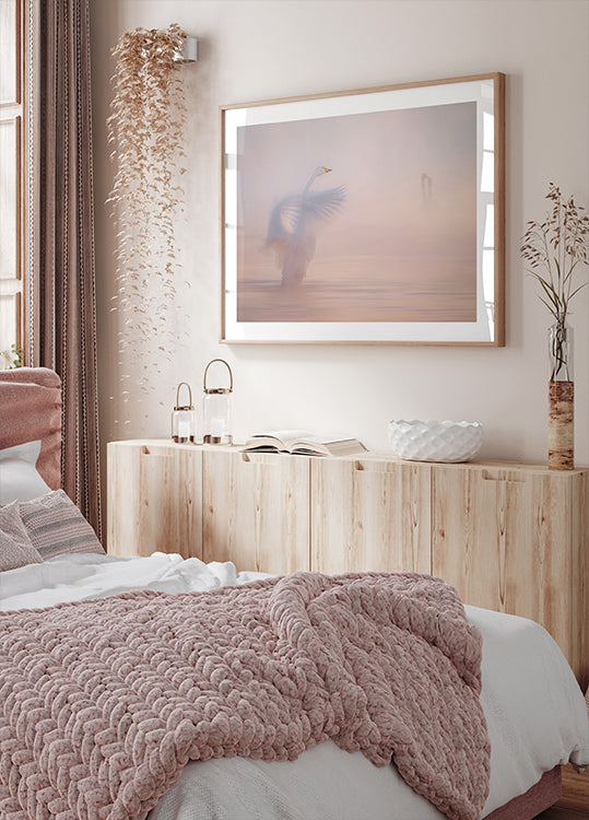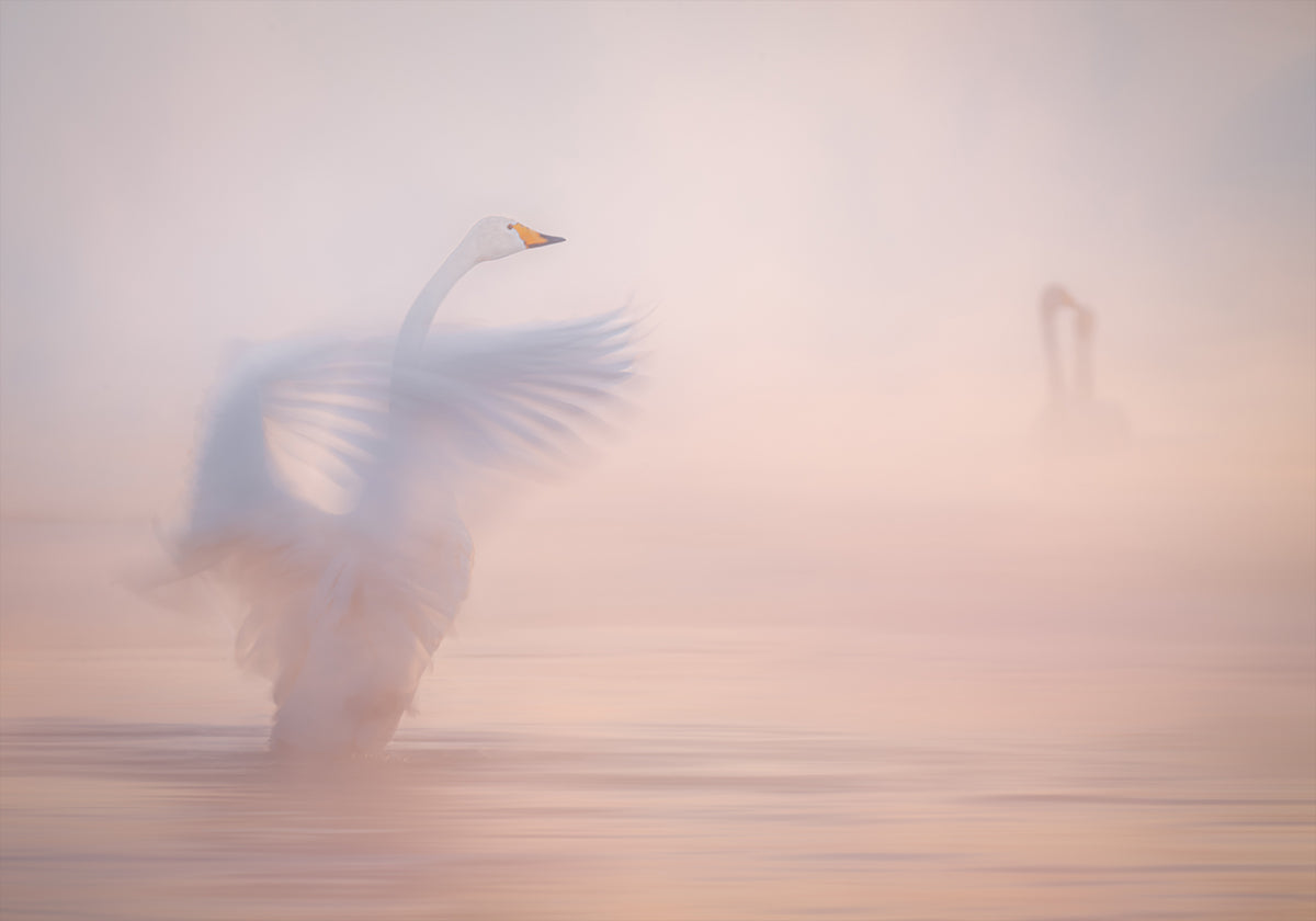 Et drømmende sceneri i rosa morgensol: en svane glider lydløst gennem tågen over havet, mens bløde bølger og spejlinger udvisker grænsen mellem vand og himmel. Alexandr Kukrinovs motiv fanger øjeblikkets skrøbelige poesi – stille længsel, ro og bevægelse på samme tid. Perfekt til rum, der kalder på eftertanke.