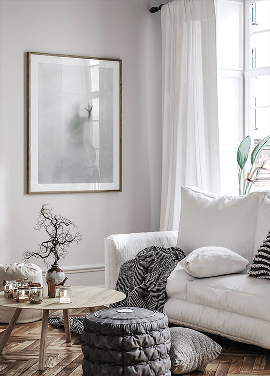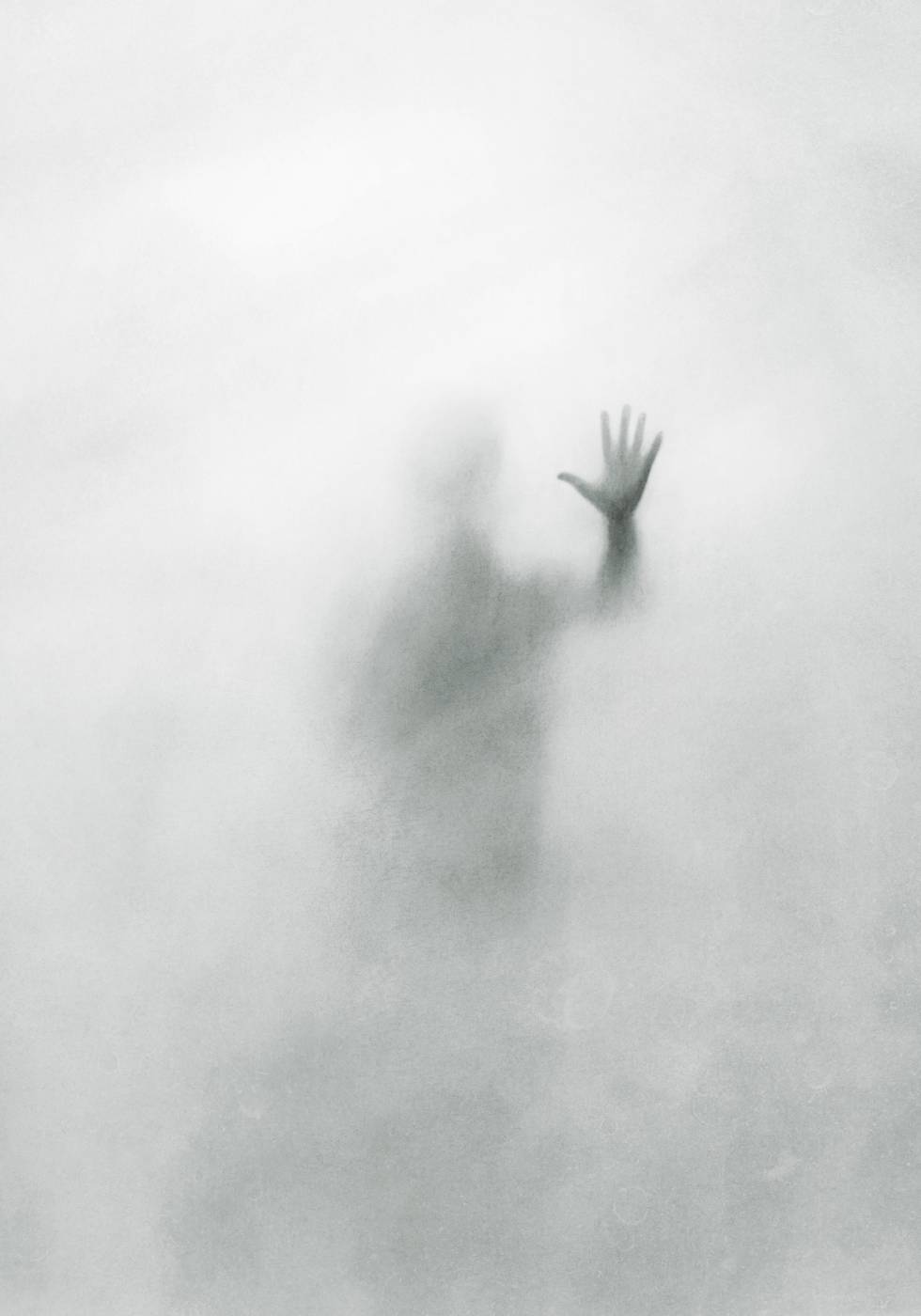 Ein verschwommenes Bild einer menschlichen Figur mit einer Hand, die gegen eine neblige Oberfläche gedrückt ist. Das eindrucksvolle und verträumte Motiv weckt Gefühle von Einsamkeit, Anspannung und Unsicherheit – perfekt für moderne, mutige Innenräume.