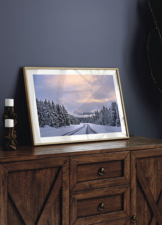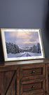 En tåget vintervej snor sig gennem tætte fyrreskove mod fjerne, sneklædte bjergtoppe, mens let dis blødgør lyset og skaber en rolig, drømmende stemning. Mei Xu indfanger følelsen af at stå på tærsklen til eventyret—et stille kald mod nordlige landskaber, frihed og fordybelse. Perfekt til at bringe kølig ro og wanderlust ind i hjemmet.