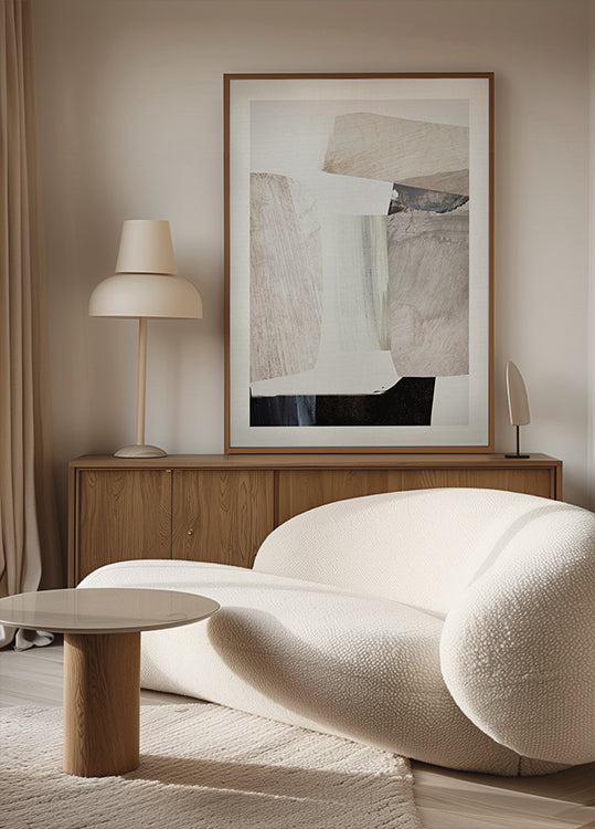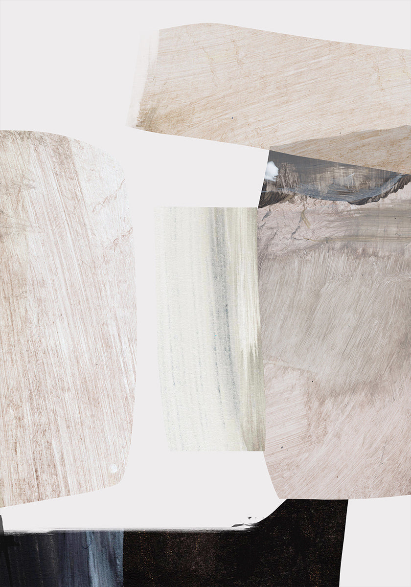 Ein minimalistisches abstraktes Poster von Dan Hobday mit sanften Pinselstrichschichten in neutralen Tönen. Die strukturierten Formen ergeben eine ausgewogene und moderne Komposition, perfekt für moderne Innenräume, skandinavisches Design oder als Teil einer beruhigenden Bilderwand.