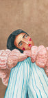 Ein figuratives Aquarell- und Mischtechnikgemälde, das eine verträumte junge Frau mit ausdrucksstarken Gesichtszügen zeigt. Ihr Gesicht ist mit Herzformen verziert und von sanften Pastellfarben umgeben, die Sinnlichkeit, Nachdenklichkeit und künstlerische Eleganz vereinen. Die Arbeit enthält eine Balance zwischen Verletzlichkeit und Stärke und schafft ein ausgesprochen modernes Porträt.