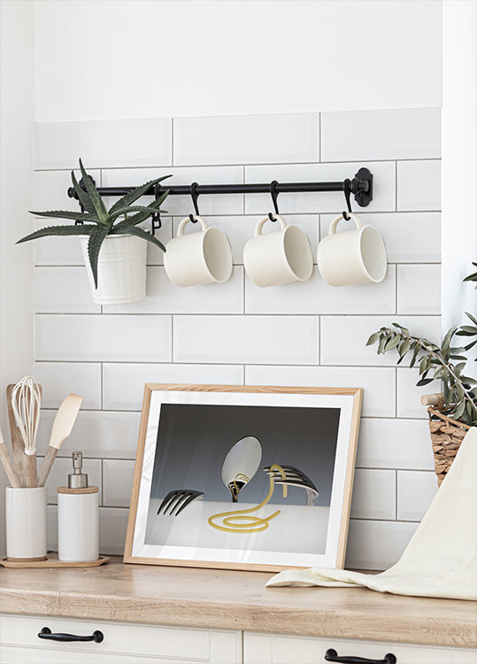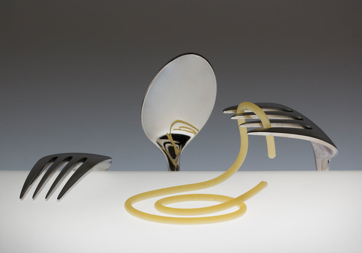 Ein verspieltes Stillleben, in dem Gabeln, ein Löffel und ein Spaghettifaden eine humorvolle Komposition ergeben. Das Besteck ist als Figuren arrangiert, während die Nudeln als fließende Haare fungieren. Dieses witzige Kunstwerk vermischt Essen und Fantasie und verwandelt eine alltägliche Mahlzeit in ein surreales, künstlerisches Porträt.
