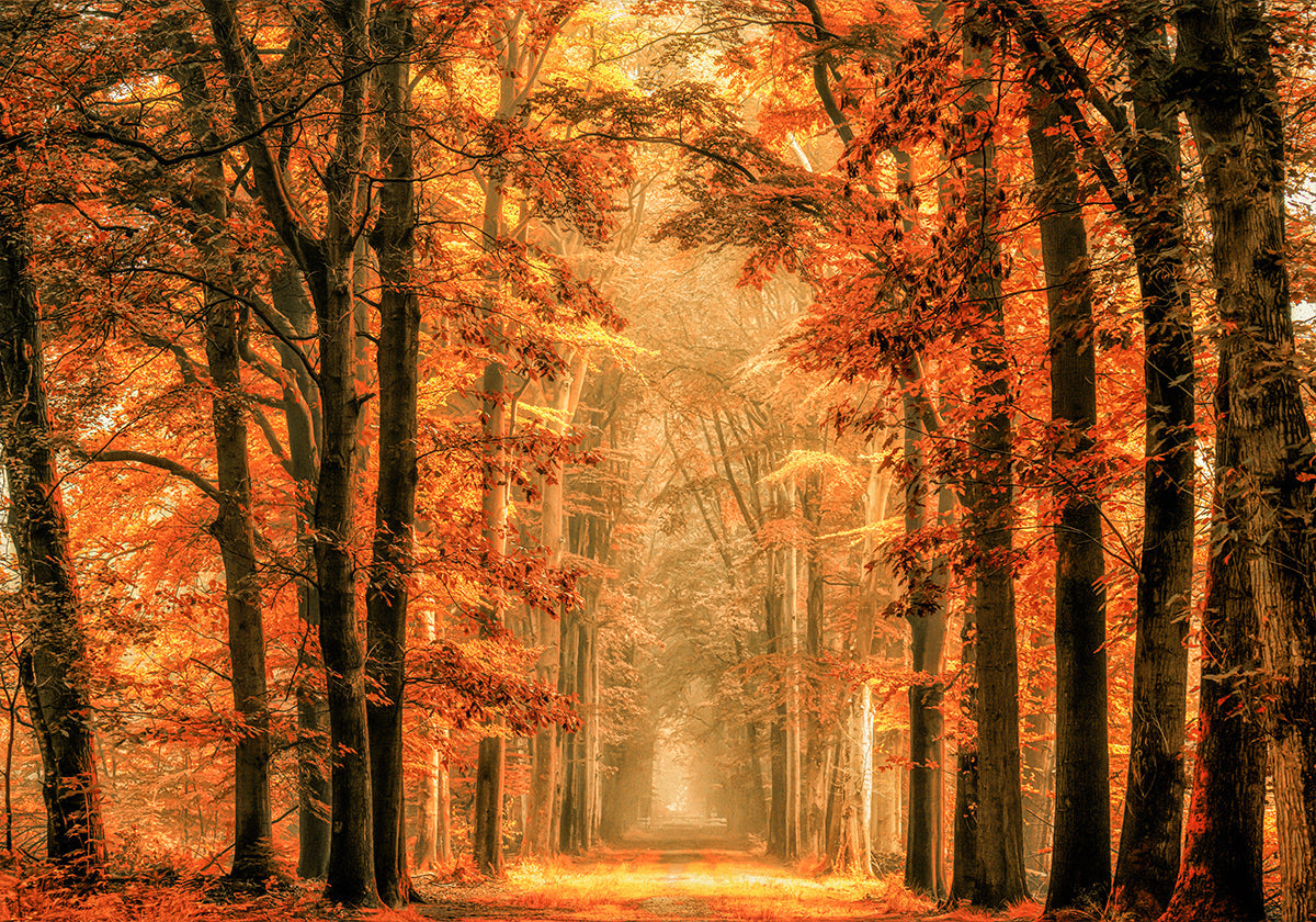 Ein atemberaubender herbstlicher Waldweg, der in goldenem Licht leuchtet und auf dem hohe Bäume einen natürlichen Tunnel bilden, der sich wie ein magisches Tor anfühlt. Die Szene strahlt Wärme, Geheimnis und die Schönheit des Herbstes aus und lädt den Betrachter zu einer abenteuerlichen Reise ein.