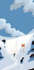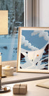 Snowy Mountain fängt den Puls des Winters ein: ein Retro-inspiriertes Ski-Poster mit einem Slalom-Rennfahrer, der einen strahlend weißen Berghang hinunterrast. Scharfe Blautöne, dramatische Wolken und schroffe Gipfel vermitteln ein Gefühl von hochalpiner Frische, Abenteuer und klassischer europäischer Skiatmosphäre. Perfekt, um Reiseträume und die Lust auf verschneite Kurven zu wecken.