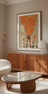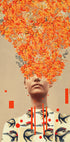 Eine surreale digitale Collage, die Porträt, Vögel und eine lebendige Explosion orangefarbener Blumen kombiniert. Das Kunstwerk kombiniert klassische botanische und ornithologische Illustrationen mit modernem Surrealismus und symbolisiert die Harmonie zwischen Mensch und Natur. Die warmen Herbsttöne machen es zu einem auffälligen Element sowohl in eklektischen als auch in modernen Innenräumen.