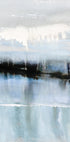Et poetisk akvarel-landskab af Mareike Böhmer: tågede blå toner flyder sammen som hav og himmel, hvor lette skyer spejler sig i stille vand. Minimalistiske konturer og delikate overgange skaber ro og dybde, en nordisk-japandi stemning, der inviterer til fordybelse og stilfuld enkelhed. Abstrakte bølger antyder kyst og tåge.