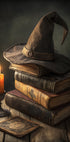 Ein geheimnisvolles und bezauberndes Kunstwerk mit einem spitzen Hexenhut, der auf einem Stapel alter Zauberbücher neben einer leuchtenden Kerze ruht. Das warme Licht und die reichhaltigen Texturen schaffen eine magische, stimmungsvolle Atmosphäre – perfekt für Halloween-Dekor, Fantasy-Liebhaber oder ein Interieur im Vintage-Stil.
